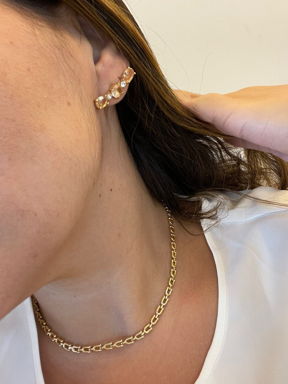SEMIJOIA BANHADA A OURO, CRAVEJADA EM ZICORCONIAS, HIPOALERGÊNICA E COM 06 MESES DE GARANTIA QUANTO AO BANHO.