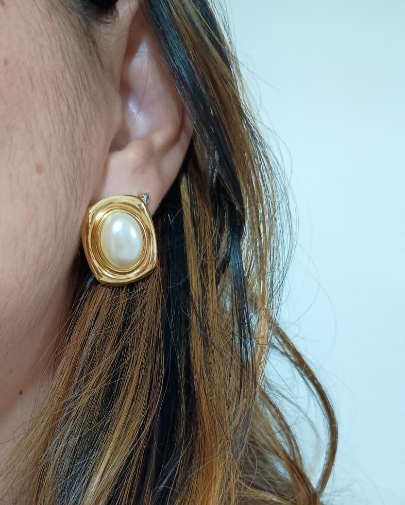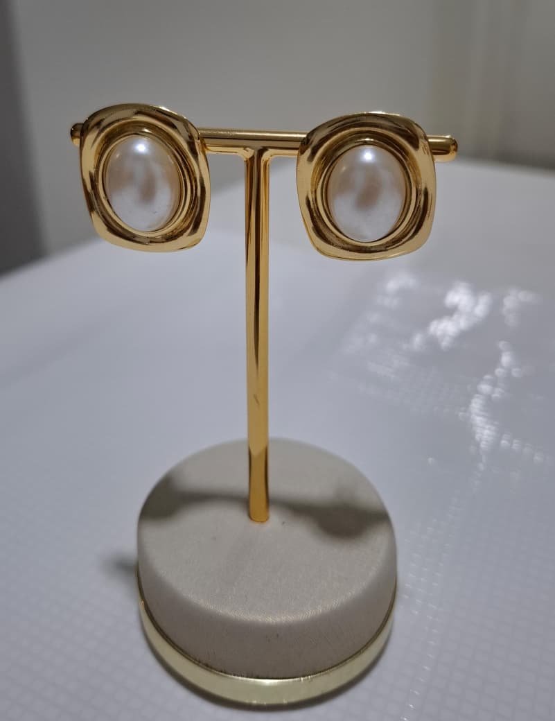 BRINCO QUADRADO COM PÉROLA EM AÇO INOXIDÁVEL DOURADO.